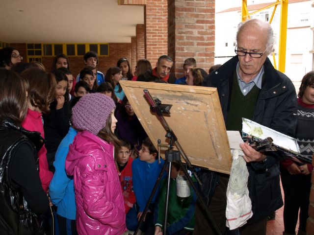 Tras recorrer las aulas, el pintor montó su caballete en el patio del colegio y pintó un paisaje murciano, observado por todos los niños del colegio, que fueron pasando clase por clase para, haciéndole corro, contemplar el desarrollo de la obra.