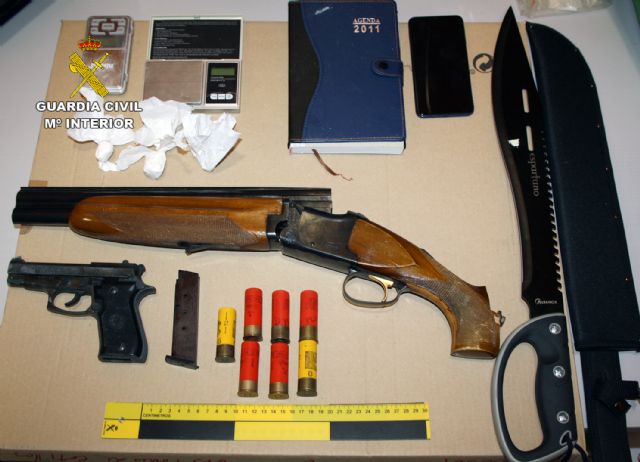 La Guardia Civil de la Región de Murcia, en el marco de los servicios establecidos para prevenir y perseguir el tráfico de drogas, ha desarrollado la operación 'BOYFRIENDS' que ha culminado con la desarticulación de un activo punto de venta de cocaína en una vivienda del municipio de Ceutí, donde han sido incautadas 100 dosis de cocaína, una escopeta de cañones recortados, una pistola detonadora modificada y abundante material para la dosificación y distribución de la droga.